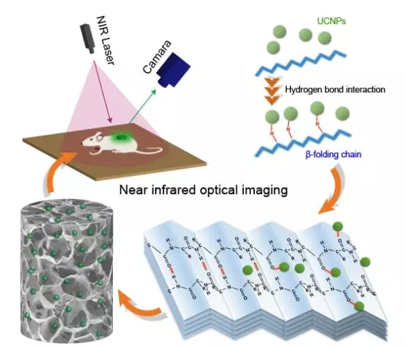 厦门大学和新加坡国立大学的林乃波的研究团队最近报道了一种创新介观尺度功能化技术,使植入体内的丝素蛋白生物支架能够在低功率的红外激发下能发出绿色荧光,实现实时的、无损伤的生物成像。该上转换荧光成像技术为直观监测体内生物支架的变化及其体内化学环境的变化提供了新思路。