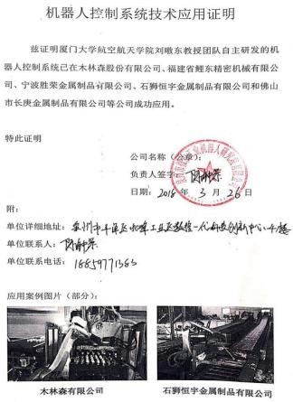 基于课题组自主研发的机器人控制器,结合机器视觉自动识别技术,分别开展了以下6个项目:(1)为四川航天世东汽车部件有限公司研发的焊接机器人焊缝自动跟踪识别系统;(2)为苏州宝丽洁公司研发的之驻守机器人湿纸巾自动识别贴盖系统;(3)为泉州港威五金制品有限公司研发了铝水自动浇注系统; (4)为晋江的沃鞋服有限公司研发的鞋模自动跟踪喷胶系统;(5)为福建省锂东精密机械有限公司研制了自动搬运识别系统;(6)为江苏太仓宝祥有色金属制品厂研制了自动码垛识别系统。