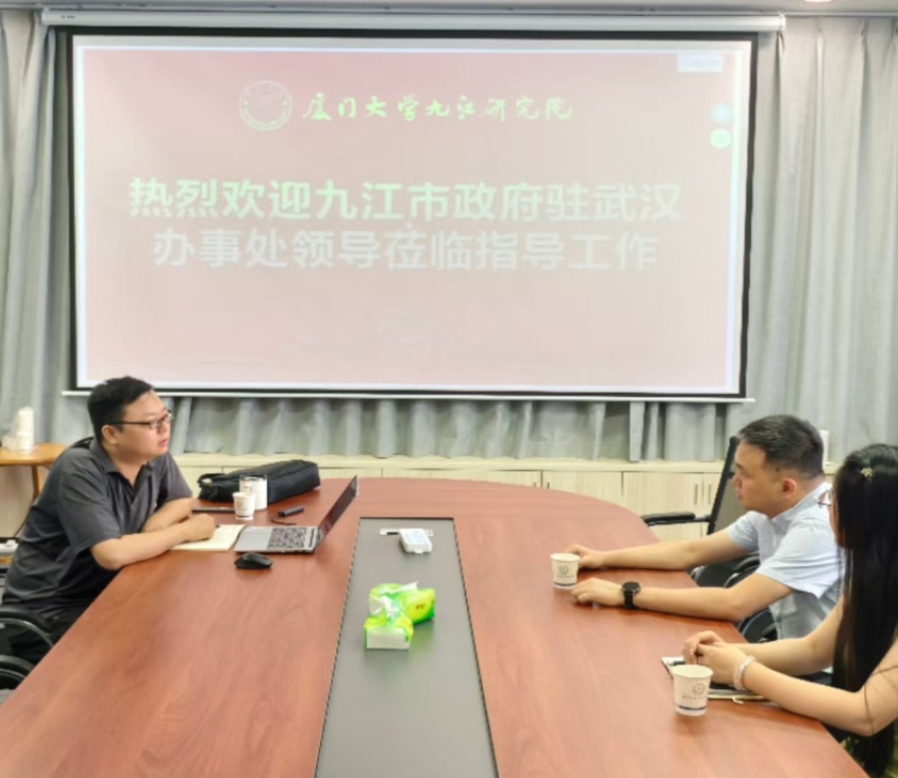 7月3日,九江市政府驻武汉办事处姜帆副主任一行莅临厦门大学九江研究院(以下简称“研究院”)调研,研究院办公室主任沈祖俊代表研究院热情接待姜主任一行。