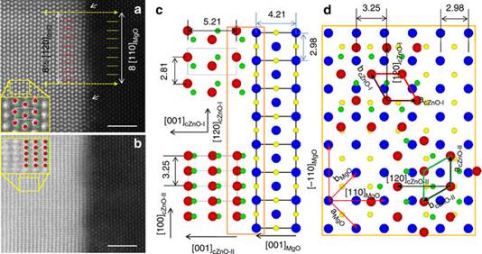 六方氧化锌(ZnO)与立方氧化镁(MgO)的界面原子结构(扫描透射电镜图及原子模型)