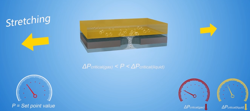 这一研究首先设计了孔径可控的高分子弹性体多孔材料,该弹性体材料具有良好的伸缩率(断裂伸缩率~450%)和稳定性(循环稳定性达500次以上)。不同的孔径设计,使得待输运流体通过膜体系的压强阈值发生改变。弹性体多孔膜具备了孔径动态可调的特性和优异的恢复能力。