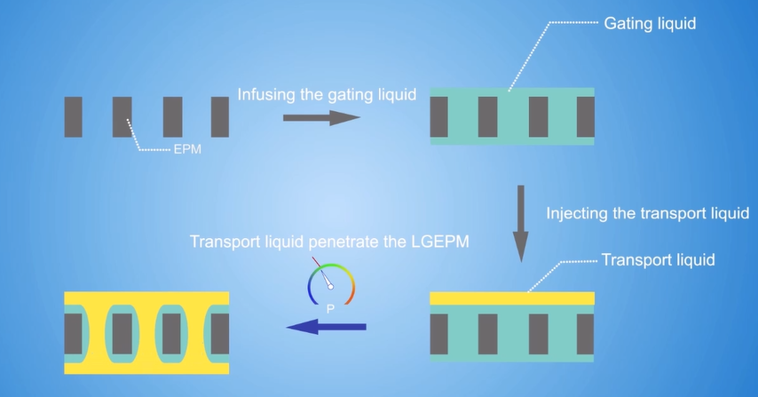 不同的功能液体与高分子膜材料之间具有不同的浸润性,通过优化浸润性条件,构筑了稳定的液体门控复合膜体系。由于功能液体与高分子膜材料的复合,避免了待输运流体与膜材料的直接接触,该体系具有优异的抗污性能。