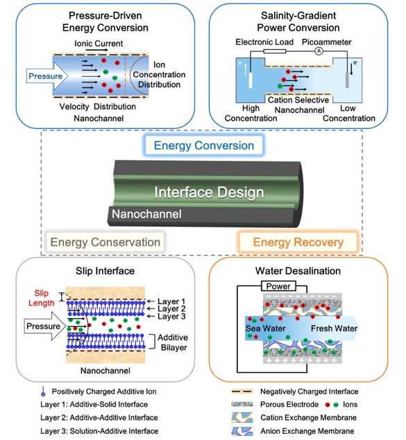 左上:压力驱动液体通过纳米通道,导致双电层中离子流动,产生电流,从而将机械能转换为电能。右上:在浓度梯度下,离子自发从高浓度向低浓度扩散,将吉布斯自由能转换为电能。左下:通过在界面修饰离子型表面活性剂,在内表面构建滑移界面。压力驱动而产生的电流与界面上离子型表面活性剂的移动有关。右下:优化设计的界面能够提高海水脱盐电容去离子化系统能源回收效率。