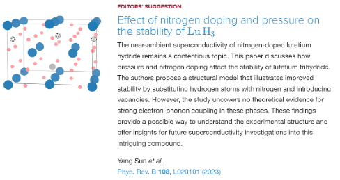 相关研究成果以“Effect of nitrogen doping and pressure on the stability of LuH3”为题在物理权威期刊Physical Review B上以Lettter快报发表,并被编辑推荐(DOI:10.1103/PhysRevB.108.L020101)。计算凝聚态物理研究组孙阳副教授为该论文的第一作者和通讯作者,吴顺情教授和爱荷华州立大学的Vladimir Antropov教授为共同通讯作者,厦门大学物理学系为第一单位。此外,孙阳吴顺情团队近期发展了多项超导与磁性材料高通量计算方法,并在硼化物等材料中做出了多项材料设计研究。