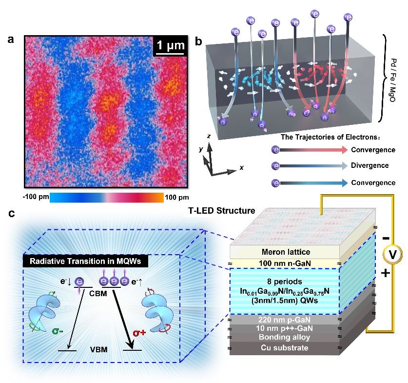 (a) 磁力显微镜下的大面积Meron晶格, (b)电子在Meron结构中运动轨迹示意图, (c) T-LED结构设计及其粒子手性传递机理示意图。