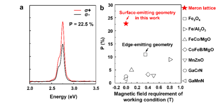 (a) 研制的T-LED自旋极化发光光谱,其自旋极化率高达22.5%, (b) T-LED自旋发光极化率与目前已有报道结果对比。